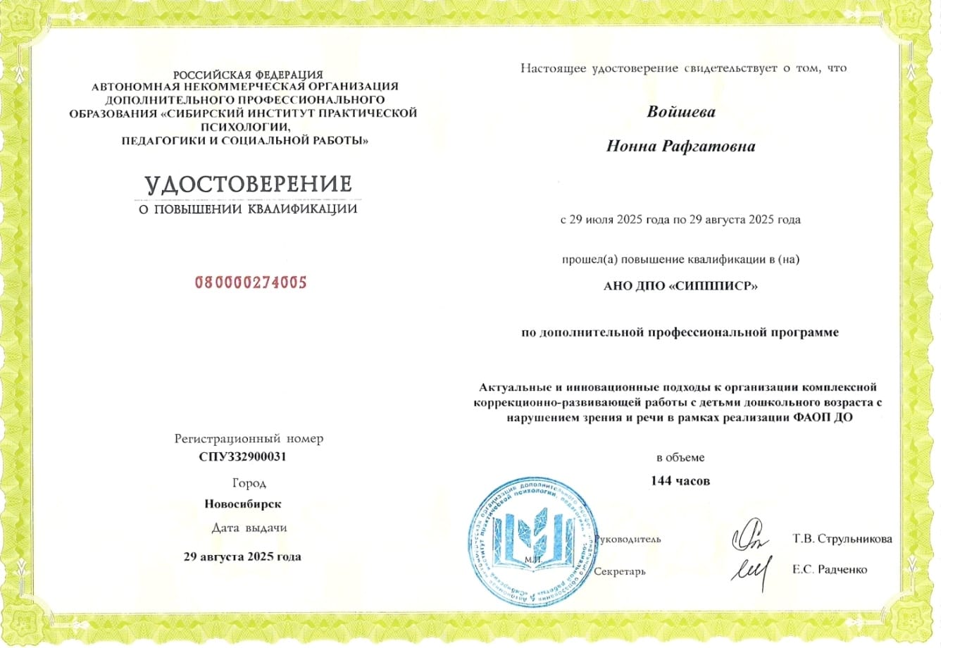 Удостоверение о повышении квалификации АНО ДПО "СИПППИСР" "Актуальные и инновационные подходы к организации комплексной коррекционно-развивающей работы с детьми дошкольного возраста с нарушением зрения и речи в рамках реализации ФАОП ДО"