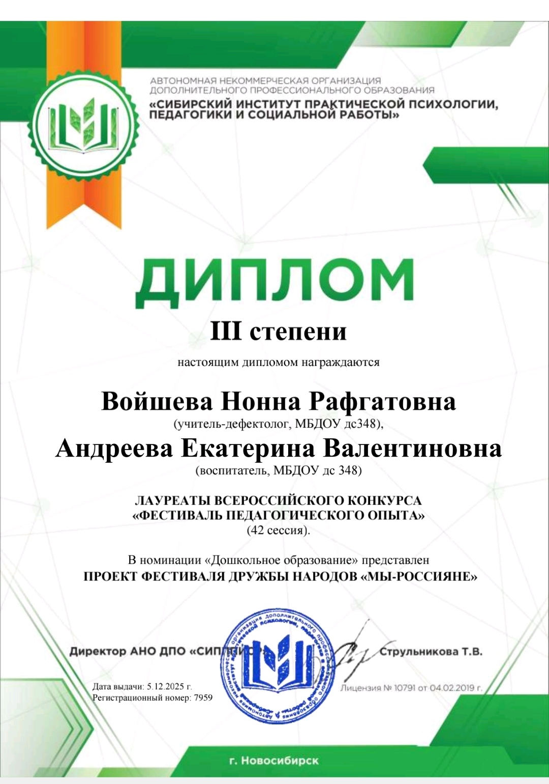 диплом 3 степени Всероссийского конкурса "Фестиваль педагогического опыта" АНО ДПО "СИПППСР"