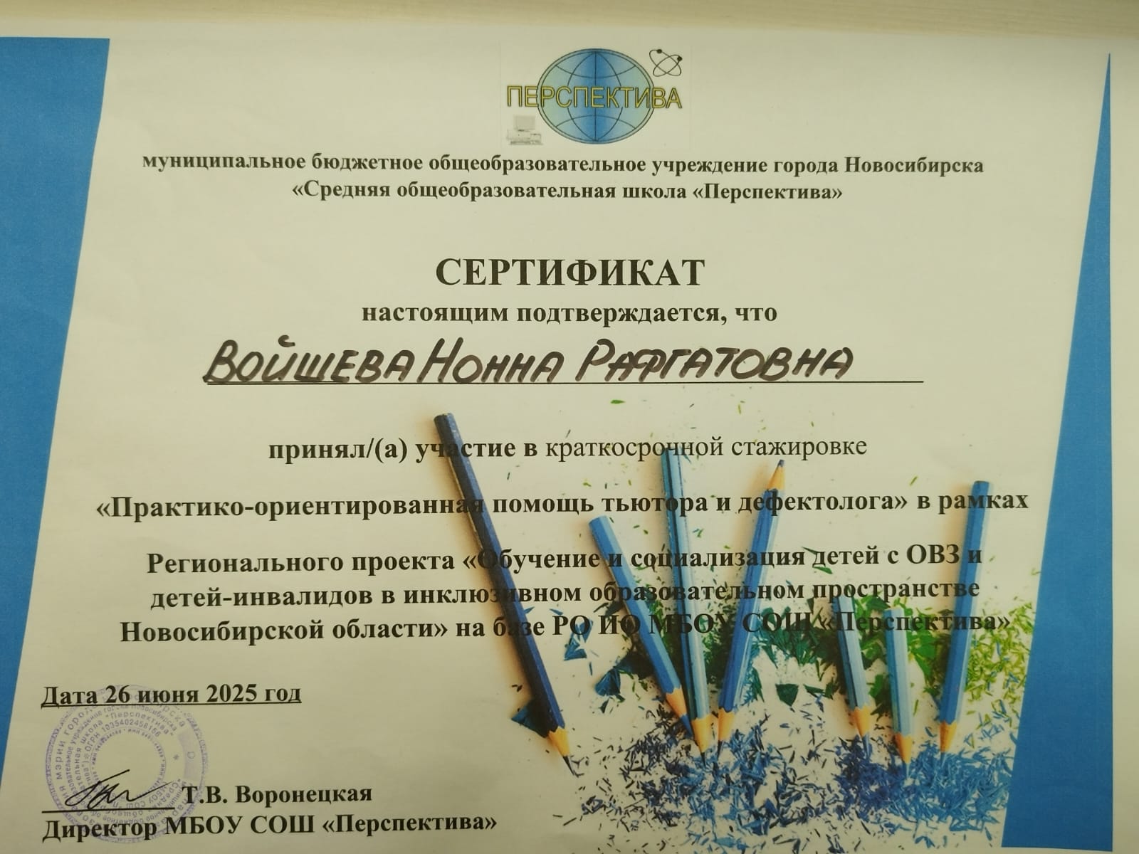 МБОУ "СОШ"Перспектива" СЕРТИФИКАТ об участии в краткосрочной стажировке "Практико-ориентированная помощь тьютора и дефектолога" в рамках Регионального проекта "Обучение и социализация детей с ОВЗ и детей инвалидов в инклюзивном образовательном пространстве Новосибирской области" на безе РО ИОМБОУ "Перспектива" 26.06.2025