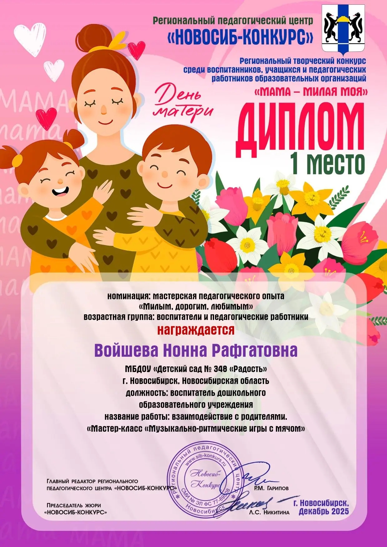 Диплом за 1 место в региональном творческом конкурсе в номинации взаимодействие с родителями МК "Музыкально-ритмические игры с мячом"